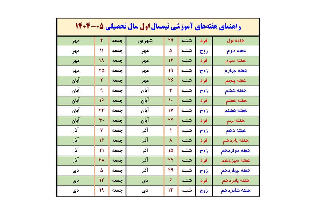 راهنمای هفته های آموزشی نیمسال اول سال تحصیلی 05-1404